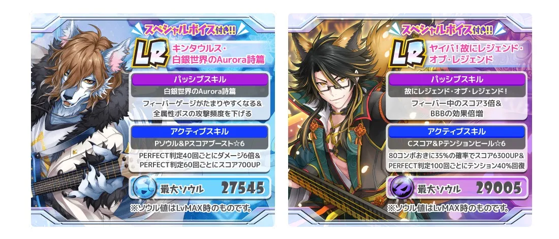 9月29日(金)より、「シンガンクリムゾンズ」のLR『ヤイバ!故にレジェンド・オブ・レジェンド』(CV:柿原 徹也)と「ガウガストライクス」のLR『キンタウルス・白銀世界のAurora詩篇』(CV:カネココウタ)を追加します。LR「キンタウルス・白銀世界のAurora詩篇」はタイアップアーティスト「カフカ」の、カネココウタさん自らのボイスを収録!ボイスはホーム画面で再生されるほか、ゲームスタート時やスキル発生時など、音ゲーのプレイ中にもそれぞれ録り下ろしボイスが再生されます。またブロマイド詳細画面でも、自由に再生することができます。