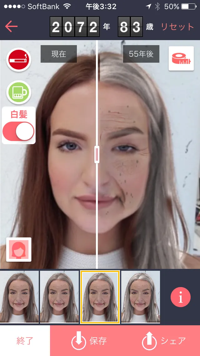 喫煙を続けた場合に、今後予想される自分の姿を年齢毎に表現します。喫煙による肌荒れ、肌のくすみなどが加齢によって加速していく様を 禁煙した場合と比べて見て行くことが可能です。