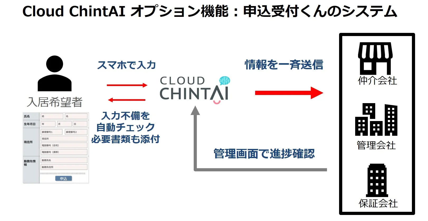 今回新しく登場した、申込受付くん(5)は、株式会社インサイト(東京都新宿区、代表取締役:福地泰)との提携により、同社が決済事業にて既に情報連動している保証会社のうち25社と順次連携。今後、連携社数のさらなる拡大を目指します。今まで手書きであった入居申込書と同様の項目をWebフォーム化。エンドユーザーが申込情報をスマートフォンで入力すると、仲介会社、管理会社、保証会社にその情報が自動で同時送信されます。入力不備を自動チェックでき、手書きによる誤読・難読も防げるため、未入力・誤記入に伴う確認・差し戻し作業が削減。申込書提出から審査受付までの時短と効率化が実現します。提携保証会社が審査ステータスを更新すると、その情報が仲介会社、管理会社にも自動通知されるため、審査の最新状況を迅速に共有可能です。