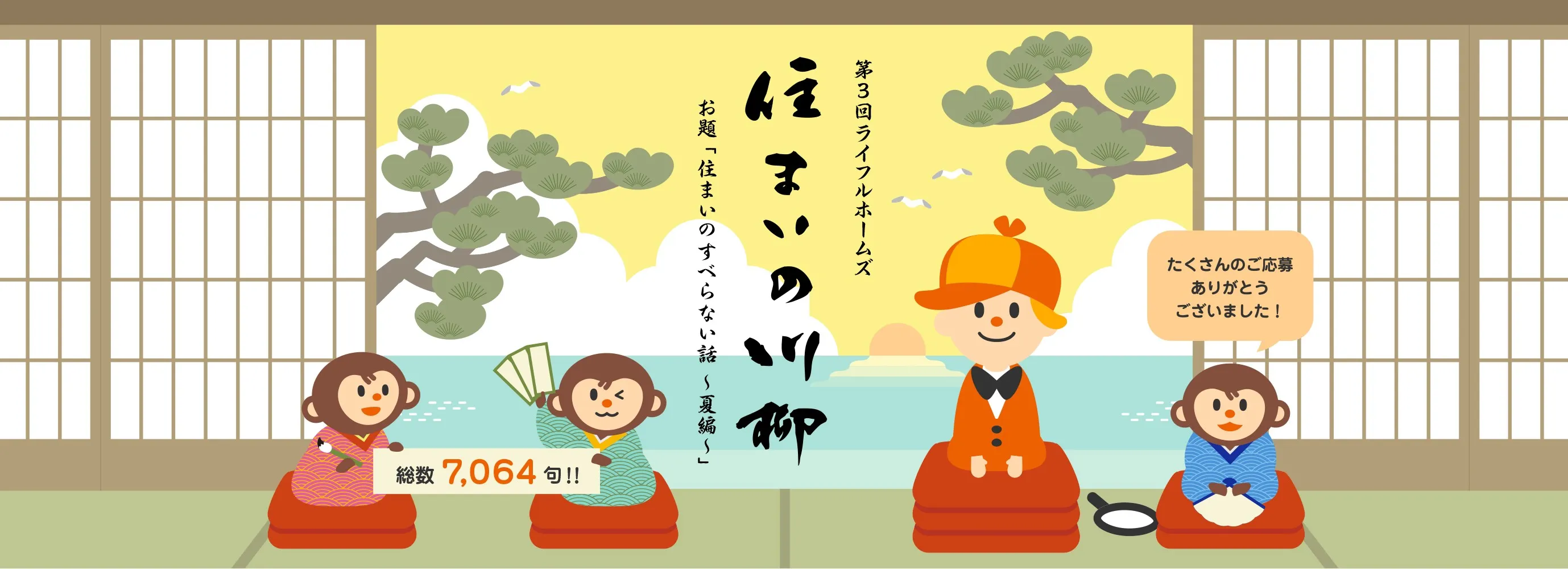「LIFULL HOME’S住まいの川柳」コンテストは、2016年夏に実施した第1回は「住まいの怖い話」、2017年1~3月の第2回は「住まいの寒~い話」をテーマとし、今回が第3回目となります。2017年6月28日から8月18日まで、「住まいのすべらない話~夏編~」をテーマとした川柳作品を募集し、応募総数7,064句もの多くのオリジナル川柳作品をお寄せいただきました。