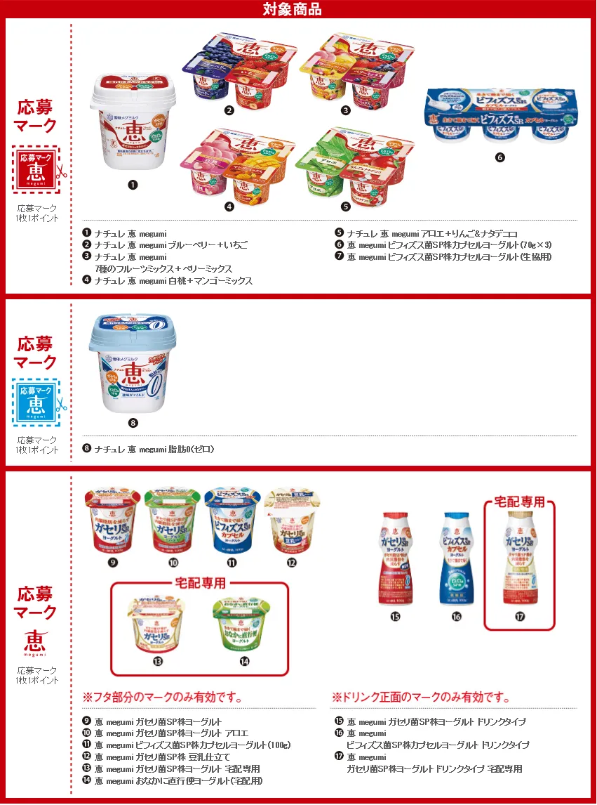 キャンペーン期間中、対象商品(「恵 megumi」シリーズのヨーグルト)に印刷されている応募マークを集めて応募すると、ポイント数に応じたコース内で組み合わせ自由な家電などのグッズやグルメが抽選で合計1,350名様に当たります。