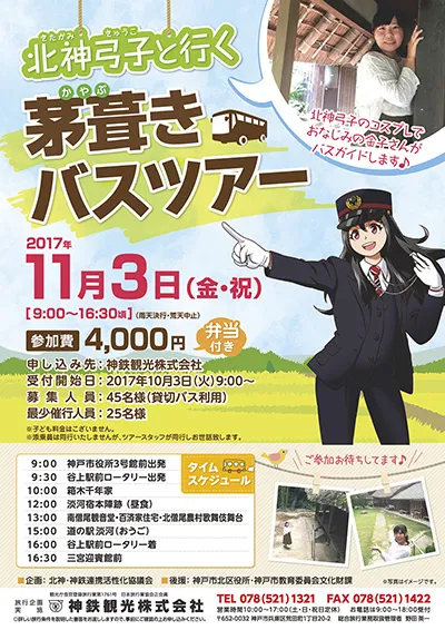 北神・北摂地域の公共交通機関等6社(神戸電鉄、北神急行電鉄、神鉄バス、神鉄タクシー、神鉄観光、神鉄エンタープライズ)で構成する「北神・神鉄連携活性化協議会(事務局:北神急行電鉄、 以下:協議会)」と神戸市北区役所は、神戸市北区に点在する茅葺き屋根の民家などを見学するバスツアーを開催します。このバスツアーでは、現存する日本最古の民家のひとつである箱木千年家とリニューアルした淡河宿本陣跡、南僧尾観音堂、百済家住宅、北僧尾農村歌舞伎舞台の見学をいたします。なお、北神急行マスコットキャラクター「北神弓子」(きたがみきゅうこ)もバスガイドとして登場します。