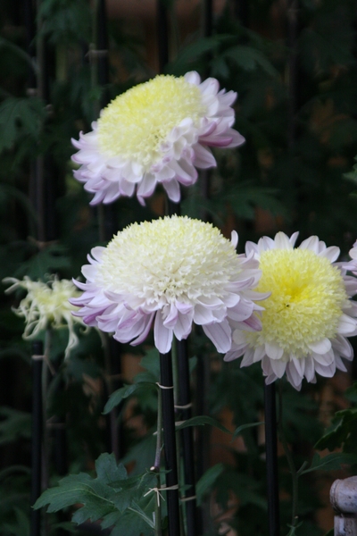 大菊の基本的な仕立て方で、一本の苗から三本の枝を伸ばし、三つの花を調和させて咲かせたもの