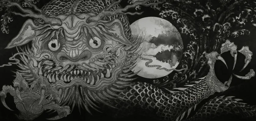 「―アジアの神々― 金子富之展」と題した本展では、インドのヒンドゥー教における三大神であり、破壊、再生と生殖を司る神シヴァを源流とし、仏教に取り入れられ日本に伝わった「摩醯首羅王(まけいしゅらおう)」やインドネシアの虎神「バロン・マチャン」、そして日本神話では当常陸国出雲大社のご祭神である大国主神の先祖とされている水を司る龍神「闇罔象神(くらみつは)」、「たかおかみ(※)」を展示いたします。アジア各地や日本には多層的で多彩な神々や精霊、妖怪が存在し、その気候や精神風土により様々なカタチへと変容し、また融合され人々の中で畏敬の対象として崇められてきました。金子は本展でアジアから日本へ流れる、こうした目に見えない強大な力の神々や精霊などの絵画による実体化に挑戦しています。小空間には作品を構築する上で生まれたドローイングやスケッチノートも展示されます。大国主神のご鎮座されるこの地において、改めてアジア圏の一部で生きる私たちに自己の存在意義と日本人として誰しもが心の奥底に持つ本能を見つめ返す機会となるのかもしれません。本展は年末から新年を迎えるに相応しい企画展として長めの会期といたしております。