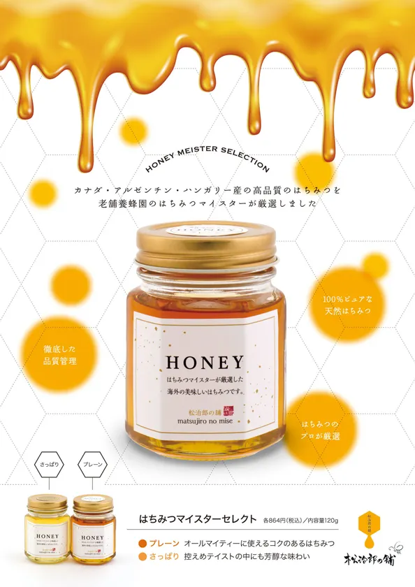 創業大正元年のはちみつ屋、株式会社松治郎の舗(所在地:三重県松阪市、代表:水谷 俊介)は、味のコクの違いによるはちみつの使い方提案として、はちみつマイスターセレクションシリーズ「プレーン」・「さっぱり」各120gを2017年10月14日から発売いたします。