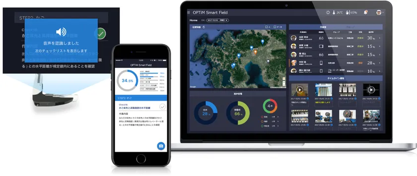 このたび発表した「Smart Field」は、遠隔作業支援に加え、作業の記録やタスク管理、位置情報管理などを行うことができ、統合的に現場での作業を管理することができるようになります。また、「Smart Field」はさまざまなデバイスに対応しており、各種スマートグラスを始めイヤホンの機能を拡大する中で生まれた、イヤラブルと言われるマイク付きイヤホン、ウェアラブルカメラなど、現場に応じたデバイスを選択できます。さらに、記録されたデータは「OPTiM Cloud IoT OS」により、音声の文字化を始め、各種AIによる解析が可能となります。