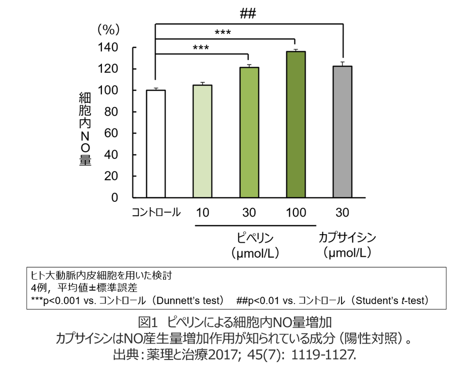 ヒト大動脈内皮細胞を培養し、ピペリンを添加して細胞内のNO量を測定しました。その結果、ピペリン30、100μ mol/Lを添加すると、ピペリンを添加しない場合に比べ、細胞内のNO量が有意に増加しました(図1)。この結果から、ピペリンはNO産生を促進することで血管を弛緩させ、血圧を低下させると考えられます。