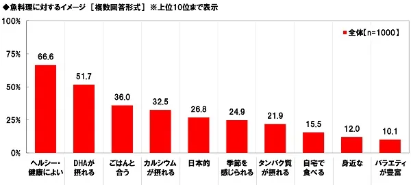 次に、全回答者(1,000名)に“魚料理”のイメージを聞いたところ、「ヘルシー・健康によい」が最も多く66.6%、次いで、「DHAが摂れる」が51.7%、「ごはんと合う」が36.0%、「カルシウムが摂れる」が32.5%、「日本的」が26.8%となりました。“魚料理”に健康的なイメージを持つ人が多いようです。