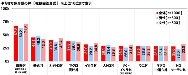 全回答者(1,000名)に、好きな魚介類の丼を聞いたところ、1位は「海鮮丼(複数の魚が乗っている丼)」(67.2%)となり、2位「鉄火丼」(45.1%)、3位「ネギトロ丼」(40.0%)、4位「マグロ漬け丼」(37.6%)、5位「イクラ丼」(32.0%)となりました。1位は、一度でたくさんの魚介を味わえる「海鮮丼」でしたが、2位から4位までは、マグロを使った丼が続きました。海鮮丼といえばマグロという人も少なくないようです。
