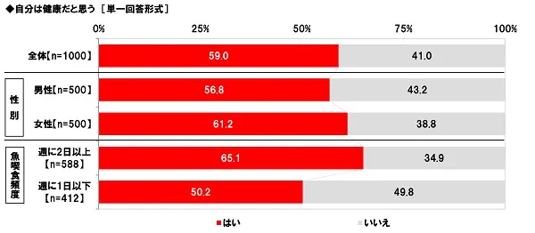 ◆「自分は健康」 週2日以上魚を食べている人では6割半も、週1日以下の人では5割