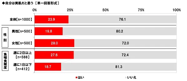 また、自分は美肌だと思う人(週2日以上27.6%、週1日以下18.7%、8.9ポイント差)や、自分は実年齢より見た目が若いと思う人(週2日以上59.2%、週1日以下50.2%、9.0ポイント差)、自分は記憶力が衰えていないと思う人(週2日以上41.2%、週1日以下26.5%、14.7ポイント差)の割合でも、週に2日以上魚を食べている人のほうが高くなりました。魚をよく食べることは、健康と美容の両方によいようです。いつまでも若々しくいたい人は、積極的に魚を食事メニューに取り入れてはどうでしょうか。