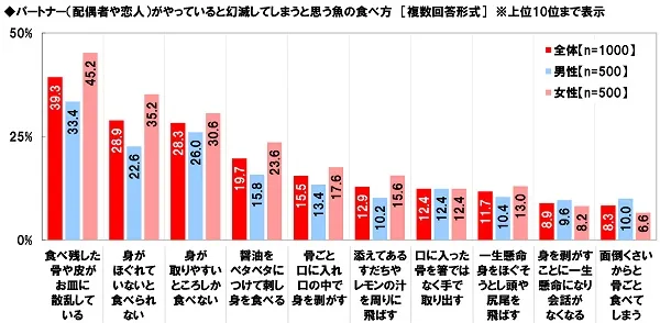 全回答者(1,000名)に、パートナーがやっていると幻滅してしまうと思う魚の食べ方を聞いたところ、「食べ残した骨や皮がお皿に散乱している」(39.3%)が最も多く、「身がほぐれていないと食べられない」(28.9%)、「身が取りやすいところしか食べない」(28.3%)、「醤油をベタベタにつけて刺し身を食べる」(19.7%)が続きました。食べ散らかしたり、身がほぐれていない・取りにくいといった理由で食べ残したりすると、幻滅してしまうという人が多いようです。また、「骨ごと口に入れ口の中で身を剥がす」(15.5%)や「面倒くさいからと骨ごと食べてしまう」(8.3%)といった豪快過ぎる食べ方、「一生懸命身をほぐそうとし頭や尻尾を飛ばす」(11.7%)や「身を剥がすことに一生懸命になり会話がなくなる」(8.9%)といった一生懸命になり過ぎての失敗も挙げられました。
