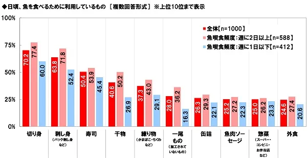 全回答者(1,000名)に、日頃、魚を食べるために利用しているものを聞いたところ、「切り身」(70.2%)が最も多く、「刺し身(パック刺し身など)」(63.8%)、「寿司」(50.4%)、「干物」(40.6%)、「練り物(かまぼこ・ちくわなど)」(37.3%)が続きました。さばいたりする必要がなく、手軽に利用できる点が好まれているのではないでしょうか。