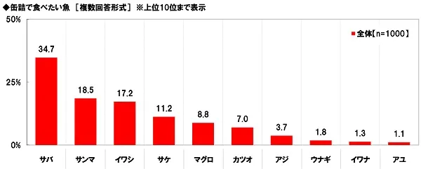 また、番外編として、全回答者(1,000名)に、【缶詰で食べたい魚】を聞いたところ、1位は「サバ」(34.7%)、2位「サンマ」(18.5%)、3位「イワシ」(17.2%)、4位「サケ」(11.2%)、5位「マグロ」(8.8%)となりました。サバの缶詰は、水煮やみそ煮、醤油煮のほか、最近ではオリーブオイル漬けも販売されており、種類の豊富さで人気になっているのではないでしょうか。