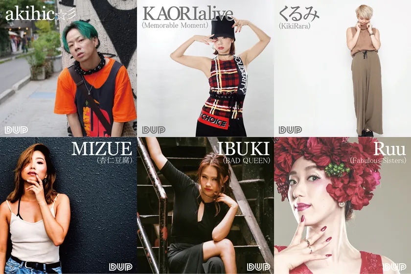 DUPでは、サービス開始月(11月予定)は、akihic☆彡、KAORIalive(Memorable Moment)、くるみ(KikiRara)、MIZUE(杏仁豆腐)、IBUKI(BAD QUEEN)、Ruu(Fabulous Sisters)と、どのダンサーもストリートダンスシーンだけに留まらず、国内外でダンサー、振付氏として多方面で活躍している世界クラスの一流ダンサーばかりです。DUPのレッスンはこのような豪華ダンサー陣がトラックメーカーと共に作り上げたこだわりのオリジナル音源をレッスンに使用します。(※通常のダンスレッスンは既存楽曲を多く使用します。)