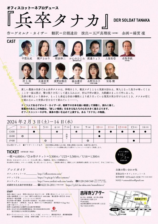 (有)オフィスコットーネ主催、『兵卒タナカ』が2024年2月3日 (土) ~2024年2月14日 (水)に吉祥寺シアター(東京都武蔵野市吉祥寺本町1丁目33番22号)にて上演されます。