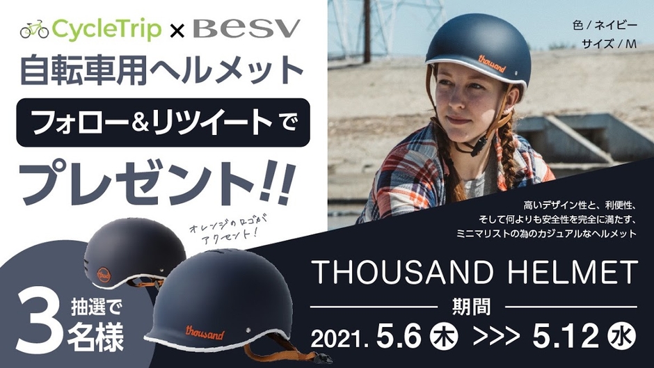 スポーツ自転車シェアアプリ「CycleTrip」を運営しているZuttoRide Sharing株式会社(本社:名古屋市中区、代表取締役:中村大)は、 この度コラボキャンペーンとして、「Thousand Helmet(サウザンドヘルメット)」を抽選で3名様にプレゼントします。