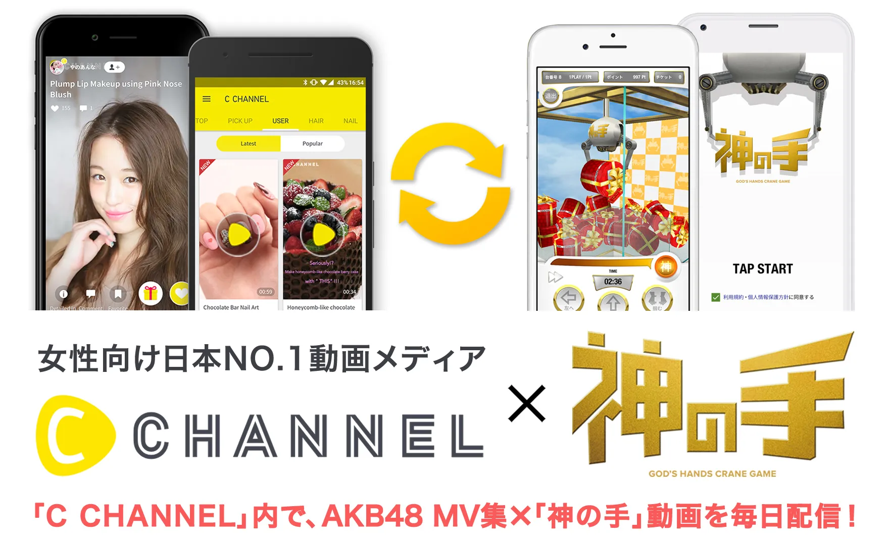日本を代表するアイドル・AKB48グループ、女性向け日本NO.1動画メディア「C CHANNEL」と、3Dバーチャルクレーンゲームアプリ「神の手」は、当コラボ企画を実施し、相互連携を行うことで、プロモーション効果の最大化を図ってまいります。