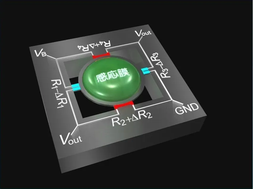図1)MSSの模式図:中央の感応膜に分子が吸着することによって生まれた表面応力を、周囲の4つのブリッジに埋め込まれた抵抗がすばやく検出する。