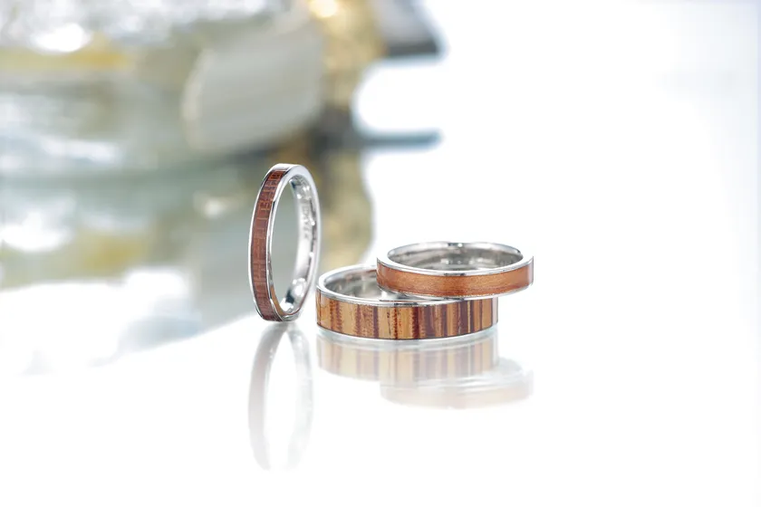 世界の美木(せかいのびもく): 縞柄のゼブラウッドや赤が美しいカリンなどを用いた指輪等