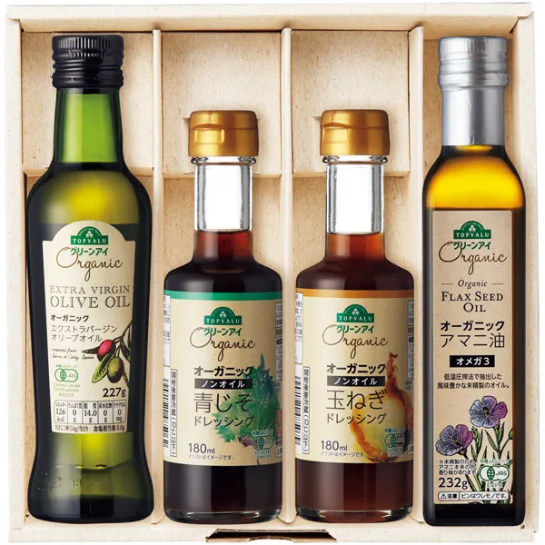 スペイン産有機オリーブを使用したエクストラバージンオリーブオイル、低温圧搾法で抽出した風味豊かなイタリア産アマニ油、香料やアミノ酸などを使わずに仕上げたノンオイルドレッシングのセットです。オイル用メジャースプーンのおまけ付き。