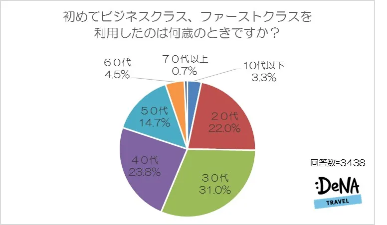 ビジネス・ファーストクラスを利用したことがある人に初めて利用した年齢を聞いたところ「30代」が最多の31.0%となりました。