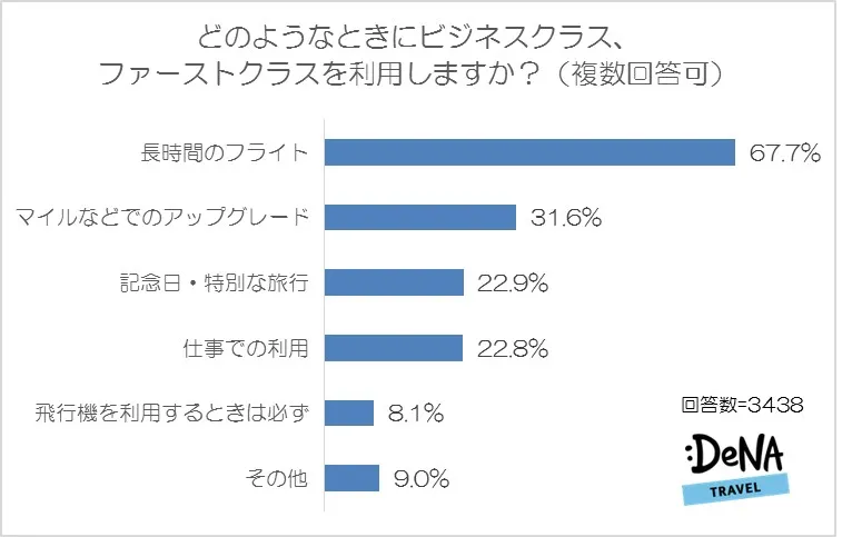 こちらの質問では「長時間のフライト」が67.7%と圧倒的多数となりました。ビジネスでの利用は22.8%とそこまで多くないようです。逆にマイルなどでのアップグレードで利用する人は31.6%と3割を超えており、追加の金額を払わずにビジネスクラス、ファーストクラスを利用している方も一定数いることがわかりました。その他の回答としては「航空会社の手違いでエコノミーからビジネスに変えてもらった」(20代男性)、「手頃な金額で出ているとき」(50代女性)などの意見が見られました。
