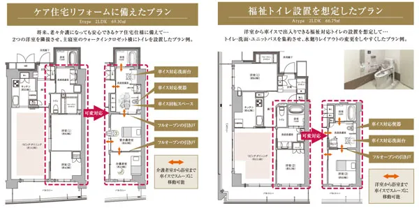 ジオ高槻ミューズレジスでは、暮らし方や家族構成、生活スタイルの変化に応じて、住宅の間取りを容易に変更できるプランニングを採用しました。将来の高齢化仕様の水廻りにリフォームし易く、洗面・トイレ・ユニットバスを集約したプラン等、何十年先にも快適な暮らしを提供できる「すまい」を実現しています。