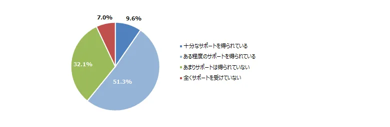 9.6%が「十分なサポートを得られている」と回答した一方、32.1%が「あまりサポートは得られていない」、7.0%が「全くサポートを受けていない」と回答した。