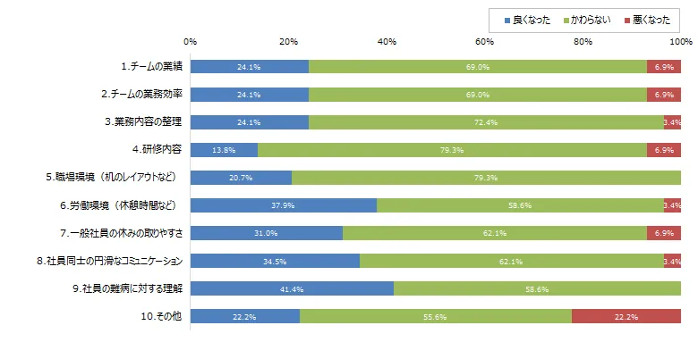 「良くなった」と回答した割合は「社員の難病に対する理解」が最も多く41.4%、次いで「労働環境」(37.9%)、「社員同士の円滑なコミュニケーション」(34.5%)と続いた。