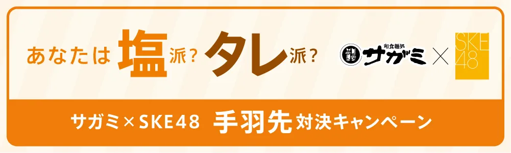 この度、和食麺処サガミを展開する株式会社サガミチェーン(本社:名古屋市守山区森孝1-1709 代表取締役社長 伊藤 修二)は、名古屋・栄を拠点に全国で活躍するアイドルグループSKE48とのタイアップキャンペーンを実施いたします。本キャンペーンは、SKE48のメンバーが塩派とタレ派に分かれて、お客様がご応募された総数を競い合い、SKE48メンバー参加のお食事会に参加できる権利などが当たるプレゼントキャンペーンとなります。