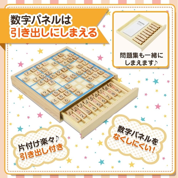 ナンバープレースの他に、たくさんの問題に挑戦できるよう100問分の問題集も付属します。ボードゲームタイプのナンバープレースは、書き込み式の本タイプとは異なり数字を書き直す手間が掛からないだけでなく、繰り返し遊べるところが魅力です。ボードには引き出しが内蔵されており、使用後は数字パネルや問題集をまとめて収納できるため紛失する心配がありません。