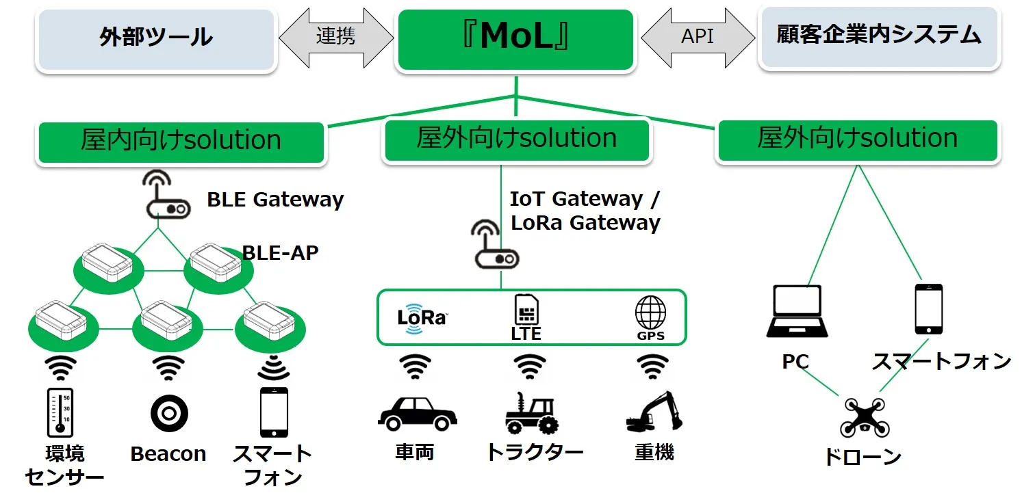 『MoL』はさまざまな業種業態に最適化ができるIoTプラットフォームです。ユーザー管理やデバイス管理に用いる基本的な管理機能(管理用サーバ・webサイト)に加え、IoTに不可欠な所在管理や動体管理、地図管理などの機能を用途に合わせて提供します。Beacon(BLE)やLoRa(※1)、Wi-Fiといった様々な通信技術に対応しているため、屋内・屋外など利用シーンに合わせた適切な方法を選定し、人やモノの「見える化」を支援します。例えば、工場・倉庫などの屋内の広い敷地ではBeaconを用いた導線分析、屋外の農地・山地などではLoRaとドローンを用いた測量や観測、といった使い分けができます。