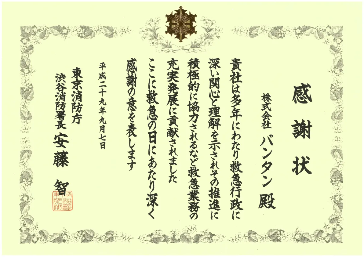 即戦力人材を育成するスクール運営事業を行っているVantan(バンタン)(本部所在地:東京都渋谷区 代表取締役社長:石川広己) は安全・安心な教育環境を提供するため、授業運営を担当する全従業員に向けて実施した「上級救命技能認定証」を取得する取り組みが、救急業務の充実発展に貢献したとして、2017年9月7日(木)に渋谷消防署より感謝状が授与されました。