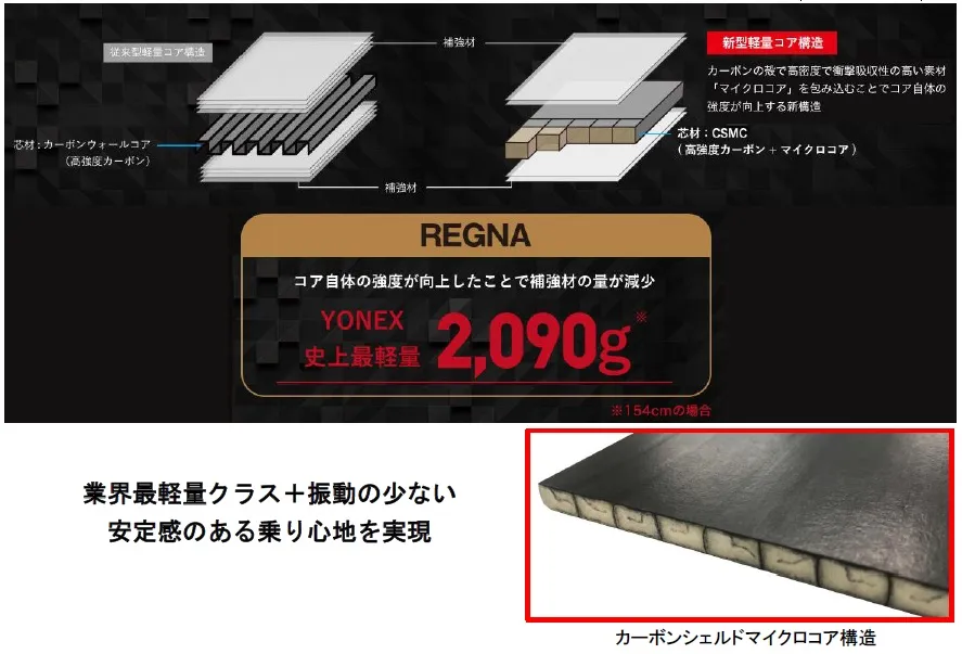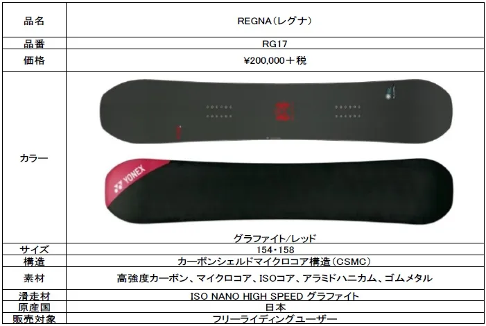 ヨネックス株式会社(代表取締役社長:林田草樹)は、新型軽量コア構造「カーボンシェルドマイクロコア構造(CSMC)」を採用し、業界最軽量クラス2,090g※の実現と安定感のある乗り心地を両立したカーボンスノーボード「REGNA(レグナ)」を数量限定で好評発売中です。ヨネックスのカーボン技術を結集し、国内自社工場で匠の技と最新技術によって生み出されたハイエンドボードです。