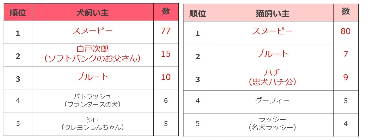 次に、犬猫飼い主別にランキングを比較しました。犬猫飼い主別に見ても、「スヌーピー」が第一位であることから、人気の高さが伺えました。