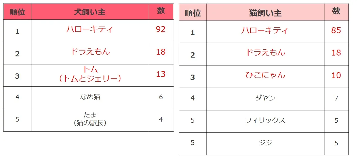 次に、犬猫飼い主別にランキングを比較しました。犬猫飼い主別に見ても、「ハローキティ」が第一位であることから、人気の高さが伺えました。