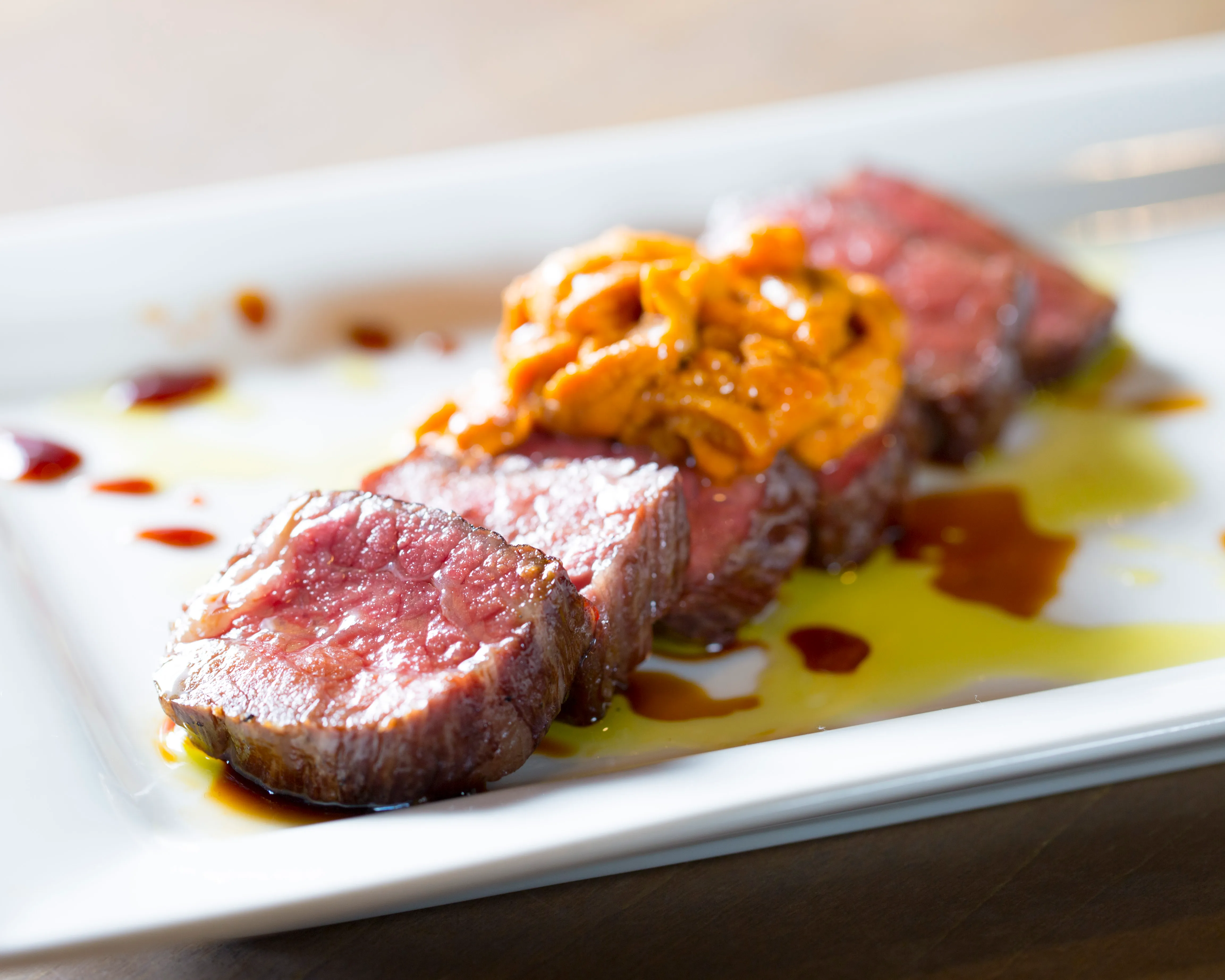 独自の熟成技術で100日以上熟成させた黒毛和牛をレアに仕上げて北海道産の雲丹を合わせ、手作りの醤油タレとオリーブオイルでシンプルに究極の旨味を表現した一皿です。