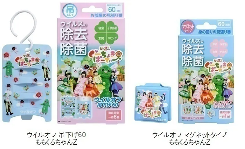 吊下げタイプの「ウイルオフ 吊下げ60 ももくろちゃんZ」とポータブルタイプの「ウイルオフ マグネットタイプ ももくろちゃんZ」は、国民的アイドルユニット“ももいろクローバーZ”の5人が「ももくろちゃんZ」として子どもたちと一緒に遊んで学ぶ番組「ぐーちょきぱーてぃー」と、二酸化塩素のウイルス・菌対策を普及させる「ウイルオフ」が、笑顔と元気を一緒にお届けしたいという共通の思いからコラボレーションが実現した商品です。全国のドラッグストアや薬局、薬店、スーパーマーケット、ホームセンター、家電量販店等で発売します。