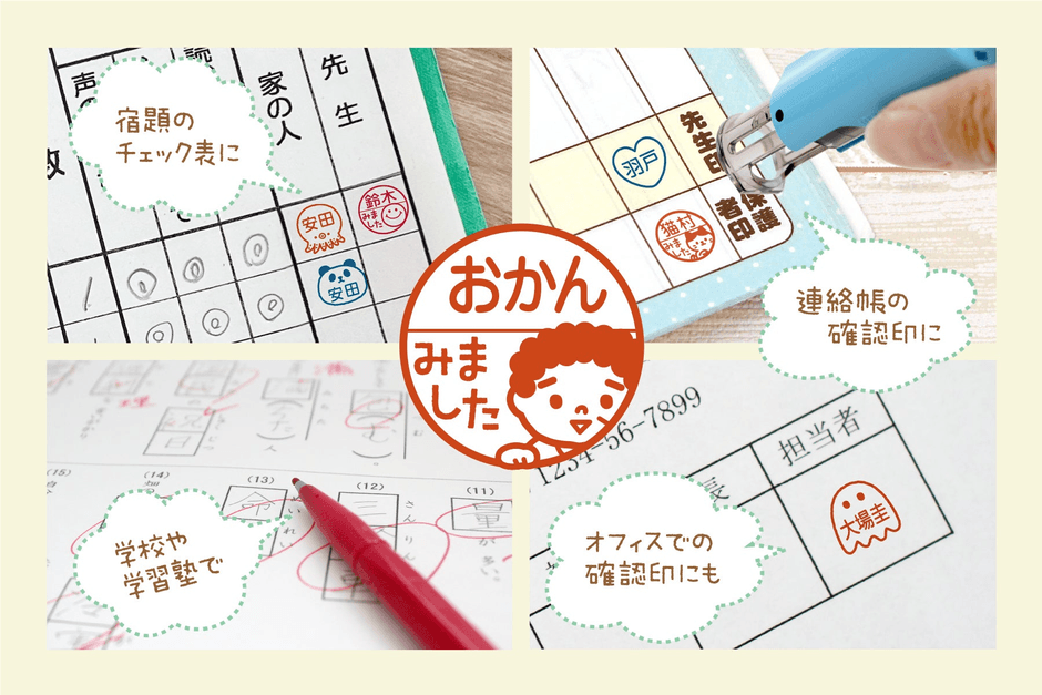 2023年1月に販売開始した「みましたスタンプ」。お子さまの連絡帳や音読カードのサイン、塾や学校の先生が提出物に押す確認印に使える、かわいいイラスト入り印鑑です。回覧板のサインやオフィスでのチェック印などにもオススメです。