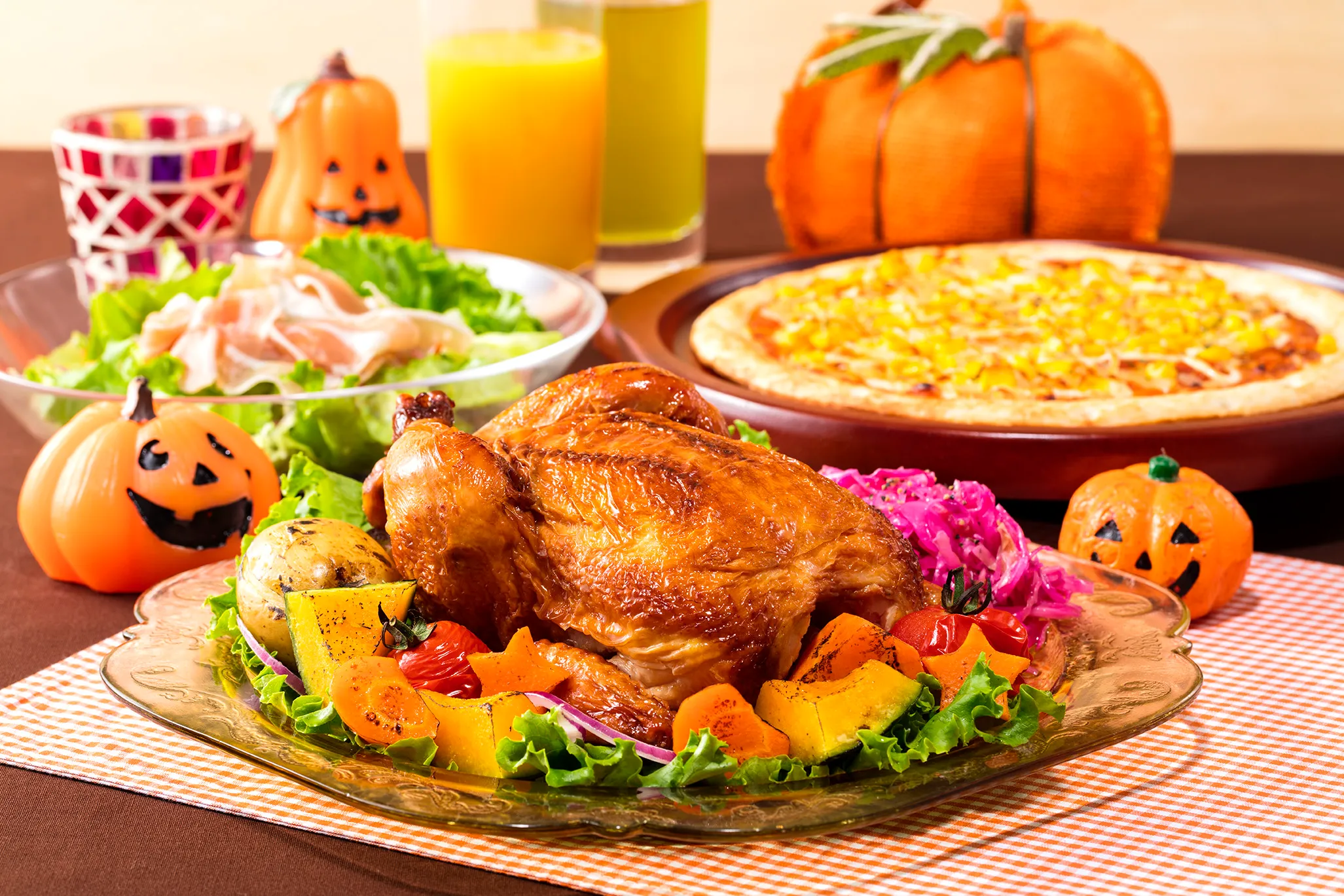 ハロウィン、七五三、クリスマス、年末年始などのイベントが増える冬のパーティーシーズンに、少人数の家族会、大人数のホームパーティーなど様々なシーンを華やかに彩ります。自家製ローストチキンに加えてピザやサラダと合わせたお得なパーティーセットもご用意しております。