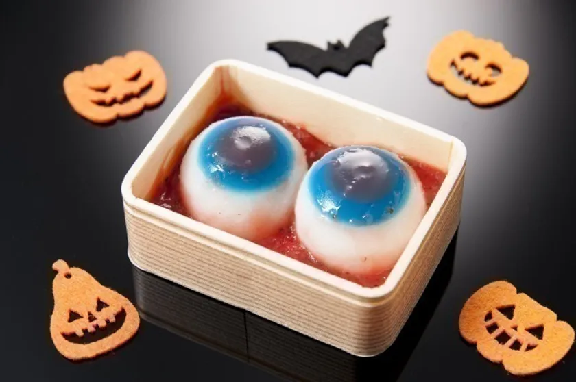 「キモかわスイーツ」は、血の海をイメージした苺ソースの上に、ギョロっとした目玉を浮かべた血みどろの「目玉の水まんじゅう」や、墓からでてくるゾンビの指をサクサクのサブレで表現した「指」、日本の伝統的な和菓子である上生菓子「おばけちゃん」の3種類となっています。