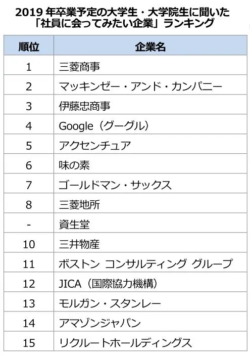 2019年卒業予定の大学生が選ぶ 「社員に会ってみたい企業」ランキング 1位 三菱商事 2位 マッキンゼー 3位 伊藤忠商事