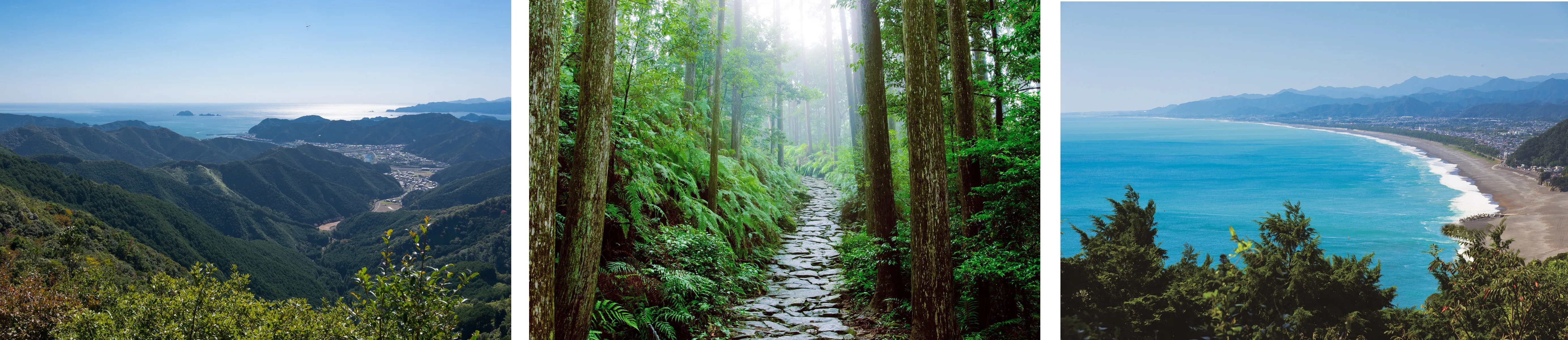 「熊野三山」とは、熊野本宮大社、熊野速玉大社、熊野那智大社の三社等の総称であり、「熊野古道 伊勢路」は、日本人にとって特別の場所である「伊勢神宮」から、いくつもの険しい峠を越え、熊野三山を詣でるために通った“祈りの道”です。古くには、「伊勢に七度、熊野に三度」という言葉もあったほど、誰もが訪れたいと願う憧れの地であり、そのような「熊野古道 伊勢路」には、今でもその景観や歴史、文化が随所に息づいています。