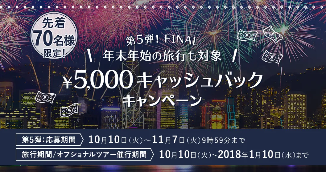 | キャッシュバック金額 | 航空券、ホテル、ツアーの合計金額(税金・サービス料・手数料込)から5,000円 |