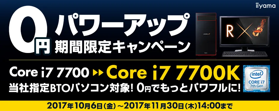 「パソコンの処理性能は速いほうがいい!」とのご要望にお応えするべく、当社指定BTOパソコンを対象に『インテル(R) Core(TM) i7-7700』から『インテル(R) Core(TM) i7-7700K』へ0円でパワーアップするお得なキャンペーンとなっています。