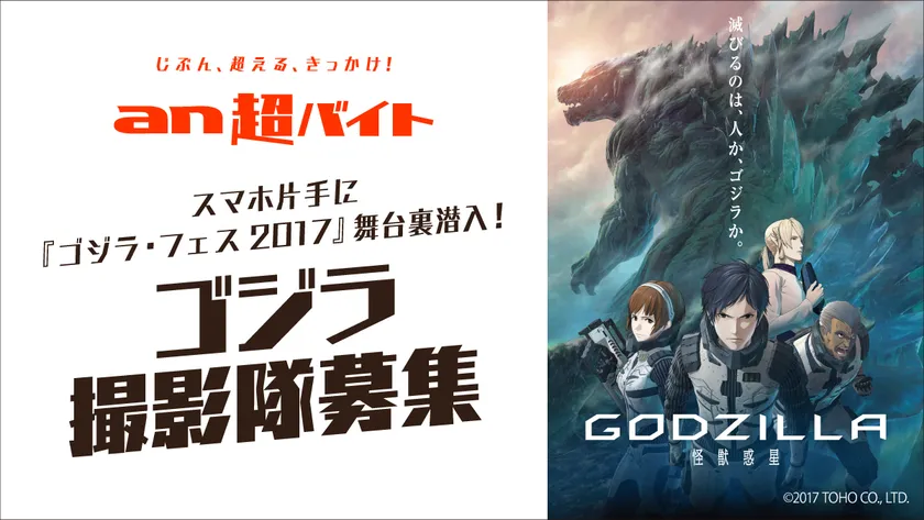 総合人材サービス、パーソルグループのパーソルキャリア株式会社(旧社名:インテリジェンス、本社:東京都千代田区、代表取締役社長:峯尾 太郎)が運営するアルバイト求人情報サービス「an」< https://weban.jp/ >は、思わず挑戦してみたくなるような「an超バイト」の新企画として、映画『GODZILLA 怪獣惑星』(2017年11月17日公開)とコラボし、2017年11月3日(金)に開催される『ゴジラ・フェス2017』の舞台裏に潜入したり、声優の花澤香菜さんや瀬下寛之監督が登壇するスペシャルトークイベントの模様などを撮影する“ゴジラ撮影隊”を募集いたします。報酬として日給5万円と、花澤香菜さんサイン入りプレスシートをプレゼントします。