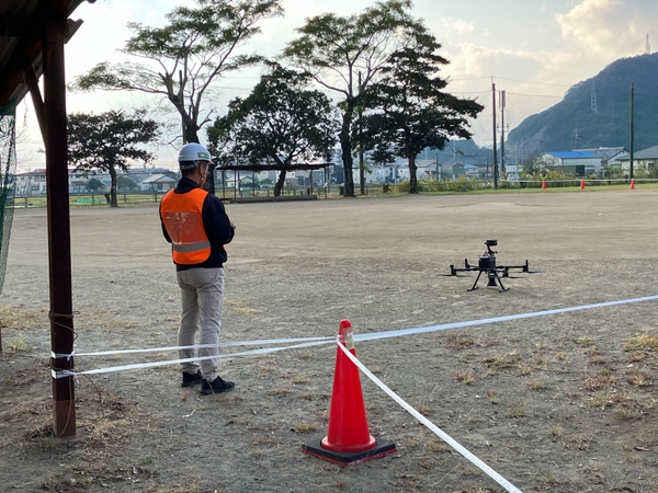 ドローンによる避難啓発では財光寺中学校・避難山の間を飛行し、ドローンに取り付けたスピーカーによって、避難をしている方々に向けて上空から避難啓発を行いました。