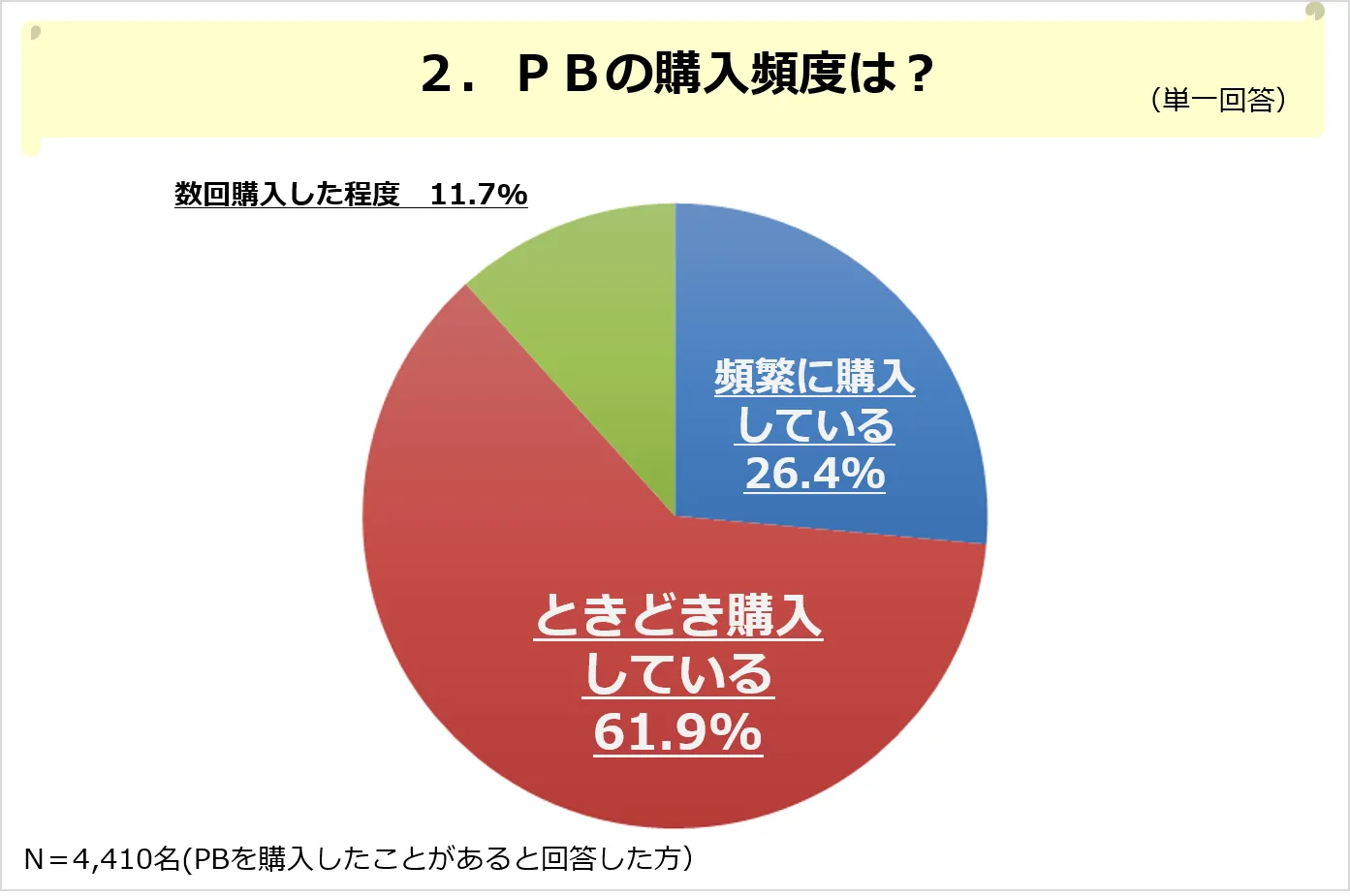 PBの購入頻度は、「頻繁に購入している」と回答した方が、26.4%で、「ときどき購入している」と回答した方が61.9%でした。購入する商品のカテゴリにもよりますが、NB(ナショナルブランド)のイメージやブランド力に左右されずに、消費者はPBを選んでいることがわかりました。