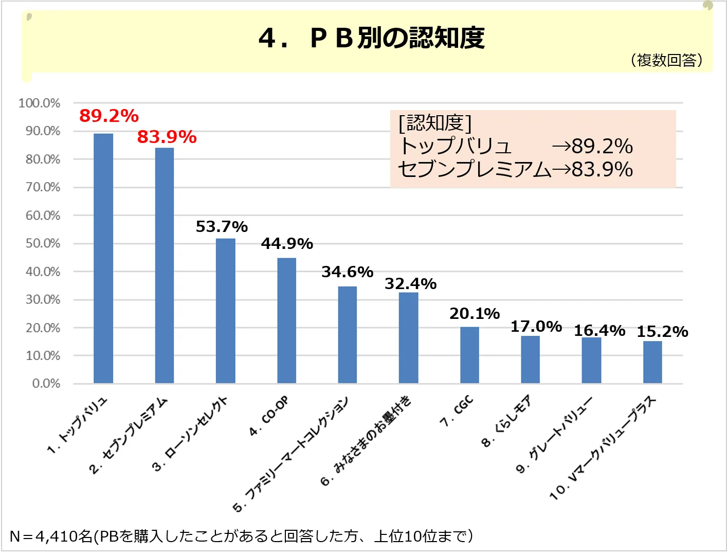 1位は、イオンのPBで1994年に誕生した、「トップバリュ」。認知度は89.2%で、もっともよく利用すると回答した方は、35.3%。2位は、セブン&アイのPBで2007年に誕生した、「セブンプレミアム」。認知度は83.9%で、もっともよく利用すると回答した方は、23.0%であり、圧倒的な規模と売上を誇る2社が多くの方の支持を集めていることがわかりました。